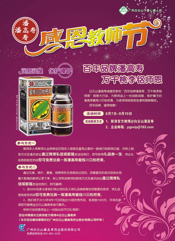 三尺講臺上,常年累月的授課,老師用嗓過度,聲音嘶啞。那代表智慧的粉筆灰在輸送知識的同時,也威脅著老師的肺部健康。 藉此教師節(jié)來臨之際,白云山潘高壽誠邀您參加“百年品牌潘高壽,萬千桃李銘師恩”感恩大行動,為恩師送上一份潤肺潤燥,保護嗓子的潘高壽蜜煉川貝枇杷膏,為老師排除肺部危害和咽喉隱憂。百年品牌,值得信賴! 一、活動對象 1、持教育局頒發(fā)的教師從業(yè)資格證的在職或退休教師; 2、普通消費者。 二、活動時間 1、作品征集、教師提供資料時間:8月7日——9月10日 2、贈品兌換時間(禮品券有效期):9月10日——10月10日 3、10部優(yōu)秀作品獲獎公布時間:9月17日。 三、活動聯(lián)系方式 1、新浪官方微博@白云山潘高壽 2、企業(yè)郵箱:pgsvip@163.com 四、活動參與方式 【參與方式一】 教師本人將教師從業(yè)資格證印有本人信息及蓋有公章的一面進行拍照或掃描,并附上聯(lián)系方式及通訊地址通過微博私信或郵箱發(fā)送給我們,即可獲得禮品券一張,憑此禮品券到指定藥房即可免費兌換一瓶潘高壽蜜煉川貝枇杷膏。 【參與方式二】 通過文章、照片、漫畫、視頻等形式將感動過您的、您最喜歡的或?qū)δ砷L有重大影響的教師記錄下來,附上您和該教師的聯(lián)系方式及通訊地址通過微博私信或郵箱發(fā)送給我們,即可贏得: 1、前5000名參與者我們將以您的名義將禮品券郵寄給您敬愛的老師,憑禮品券到指定藥房即可免費兌換一瓶潘高壽蜜煉川貝枇杷膏。 2、我們將于2012年9月17日評選出10部優(yōu)秀作品,各獎勵1000元,并將在新浪官方微博@白云山潘高壽進行展示。 五、作品要求 1、作品必須在活動規(guī)定時間予以提交(8月7日——9月10日); 2、作品必須附上作者及該教師的聯(lián)系方式及通訊地址(姓名、聯(lián)系電話、通訊地址,當?shù)剜]編); 3、作品內(nèi)容須健康向上,不得以揭露他人隱私為目的,不得含有任何不合法信息,否則一律視為不合格作品。 六、禮品送達及獲獎信息發(fā)布方式 1、對于可獲得禮品券的前5000名教師,我們會以信件的方式把相關獲獎憑證郵寄到其通訊地址;同時,我們將以短信或郵件的方式通知作品原作者,以方便其及時知曉活動進展情況。 2、9月11日后,我們將在所有合格作品中公平公正地評選出10部優(yōu)秀代表作,并于9月17日公布獲獎名單,同時在企業(yè)官方微博@白云山潘高壽 進行作品展示!屆時,我們會及時聯(lián)系獲獎者,給予每位獲獎者1000元獎金! 快快行動給恩師送上一份貼心的節(jié)日禮物吧! 活動咨詢電話:400-880-3328 活動詳情請關注新浪官方微博@白云山潘高壽 (本次活動最終解釋權歸廣州白云山潘高壽藥業(yè)股份有限公司所有)