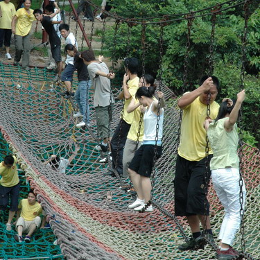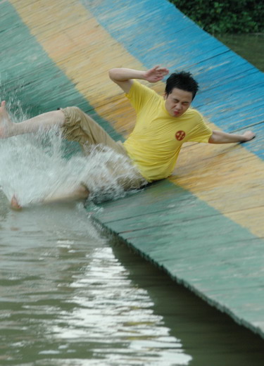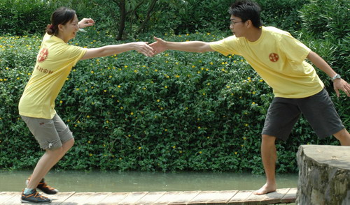 看!走“天梯”,十指緊扣,管他(她)是否意中人(圖1),只要一起度過就行(圖2);瞧!過浮橋,認準目標,沖啊!可惜,“馬失前蹄”。瞧!“天橋”,左手伸來右手接(圖3)。我為人人,人人為我……