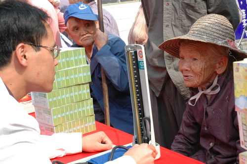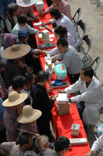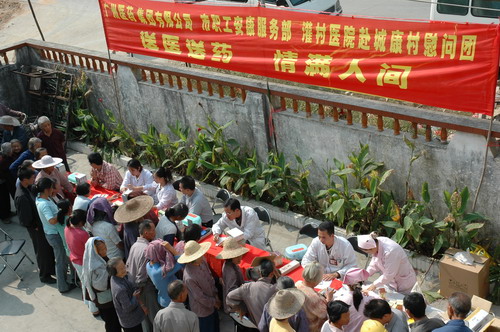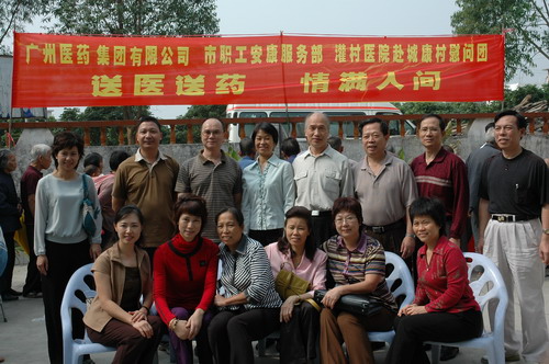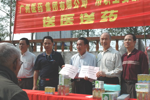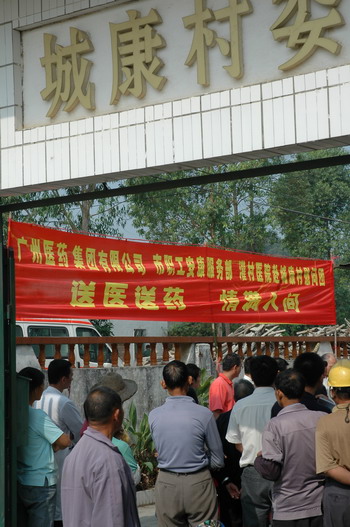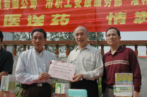 兩邊紫荊花伴,一條平坦大道延伸至從化城郊鎮(zhèn)城康村前,15日上午,該村委會(huì)的小院再度熱鬧起來(lái)。廣藥集團(tuán)下屬潘高壽、市醫(yī)藥公司、市藥材公司以及灌村醫(yī)院、從化公路局等單位組成的慰問(wèn)團(tuán)在此向村民送醫(yī)贈(zèng)藥。潘高壽和從化市公路局送上3萬(wàn)元修路費(fèi)。同時(shí),潘高壽還送去治咳嗽、治感冒等九個(gè)品種藥物一批。灌村醫(yī)院、市第一工人療養(yǎng)院醫(yī)生為村民義診。
