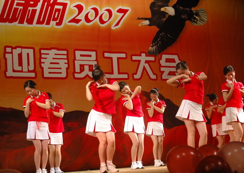 紅彤彤,火熱熱——是10個青春亮麗的姑娘翩翩起舞,吸引住臺下員工們的眼球.舞者是誰?定睛細看,呵,原來是并肩工作的同事。這里是2月17日我司在江南大戲院召開的迎春員工大會上,文藝表演的一鏡頭。這個寓意只有企業興旺,員工們才能過上好生活;只有常懷感恩之心,工作才有干勁的名為《感恩之心》的舞蹈是公司禮儀小姐隊成員自編自排的。可知道這場舞凝聚了她們多少心血。姑娘們只利用了兩天午飯前后時間學習了基本動作,然后下班回家再苦練,個別人甚至練到膝蓋發淤。就憑著一股韌勁,硬把這個舞蹈拿下來。可知,因為感恩,所以刻苦;因為勤勞,所以美麗!