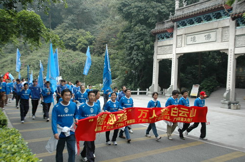 冬日陽光明媚,照在人們的身上,更顯精神抖擻,面貌一新。8時30分,由廣藥集團、發展集團眾領導引領的隊伍率先向山頂公園進發。一路振臂高呼,一路引吭高歌。潘高壽的隊伍打著“星群潘高壽、創和諧迎亞運”的橫幅也分外醒目。員工們穿著整齊的藍色短袖,步履輕盈。隊伍中有十幾二十歲的青壯年,更多的卻是中老年職工,但爬起山來她們卻絲毫不遜色。開心爽朗的笑聲不絕于耳,穿繞著碧綠蔥蔥的白云山。登山隊伍走在蜿蜒的山路上宛如一條色彩繽紛、連綿不絕的長龍,預示著廣藥集團的迅速發展和全面騰飛。登頂后,大家興高采烈,紛紛照相留念,留下健康的笑臉,更展現了和諧、進取、奮發向上的風貌和勇攀高峰的堅定信心……