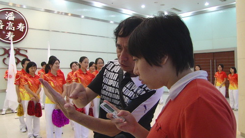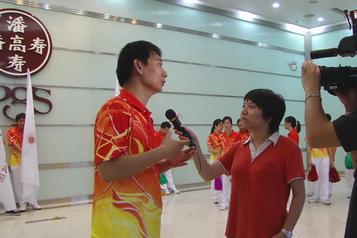 領操戎全剛向記者介紹助威操排練情況