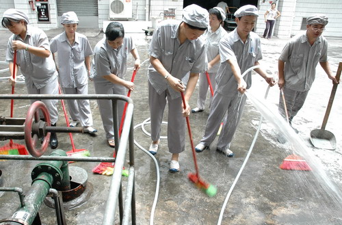 在她身上體現(xiàn)出中國婦女質(zhì)樸、善良、勤勞的傳統(tǒng)美德。另方面也反映了他們勤雜組的風(fēng)貌來。“敏姐可以說是模范,在她感染下,大家都老實(shí)干,挺融合的”邱詩平副班長在工作的間隙與我聊起來。那天我趕上他們在車間天井倉庫前的“會戰(zhàn)”(見圖),只見,我掃罷時(shí)你沖水,還有她來洗擦忙。干凈利落,非常合拍,可見工底匪淺。平時(shí),他們分布在6萬平方的廠區(qū)公共范圍里。勞作不乏臟、苦、累。對廢品池、廁所的衛(wèi)生一點(diǎn)也不馬虎。車間的廁所一天清洗4次,潔凈度堪比星級酒店。不管風(fēng)吹雨打烈日烤,他們每天都堅(jiān)守各自崗位。他們當(dāng)中不少是帶病工作的,但都無怨無悔。“工作無貴賤,我們是‘為人民服務(wù)’啊,大家的滿意就是我們的快樂”關(guān)若容組長的話算高調(diào)了,但不令人反感,皆因他們的底氣實(shí)在足啊。